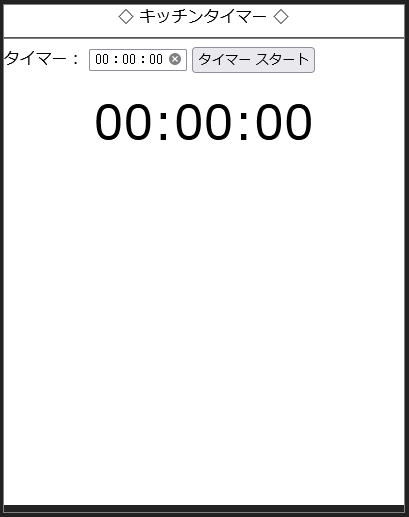 | <!DOCTYPE html PUBLIC "-//W3C//DTD HTML 4.01//EN" "http://www.w3.org/TR/html4/strict.dtd"> <html> <head> <meta charset="utf-8"> <title>キッチンタイマー</title> </head> <body bgcolor="white" text="black"> <center>◇ キッチンタイマー ◇</center> <hr> <label for="timer">タイマー:</label> <input type="time" id="timer" name="timer" step="1" value="00:00:00"> <button id="start_btn">タイマー スタート</button> <p> <div id="message" style="text-align:center; font-size:300%;">00:00:00</div> </p> <script type="text/javascript"> // ここにプログラムを書く // </script> </body> </html> |