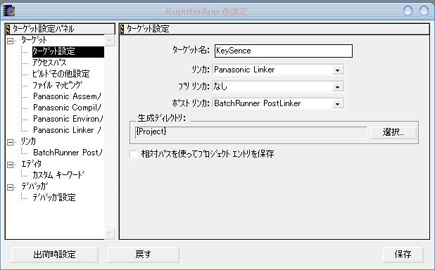 このWindow中の上にあるボタンの内、一番左の「ターゲット設定」ボタンを押して、プロジェクトの設定をまずします。